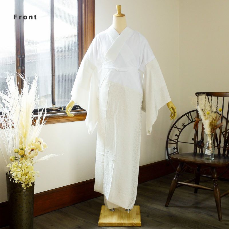 【色柄】襦袢の身頃は白地。袖と腰から下の裾よけ部分は唐草文様の地模様、色はオフホワイト。