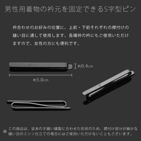 衿元を固定してはだけるのを防いでくれるS字型ピンです。
