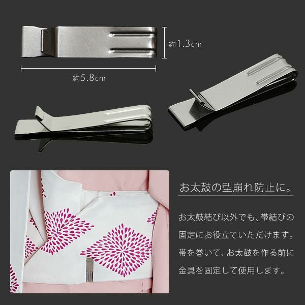 帯を巻いて、お太鼓を作る前に金具を固定します。お太鼓を作る際に、金具で止めるので、その部分を結ぶ必要がなく、帯を痛めません。男結びの貝の口にもご使用いただけます。