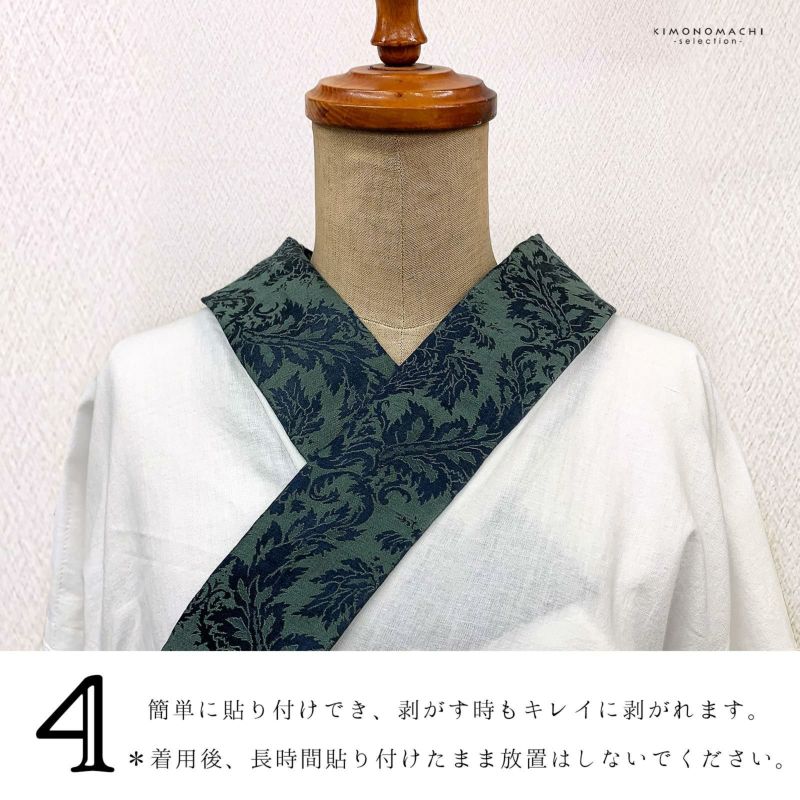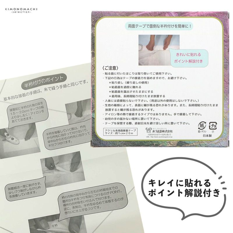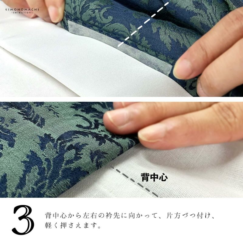 両面テープを長襦袢側に接着して付けるので、半衿を引っ張りながら付けることができ、綺麗に仕上がります。剥がすときも綺麗に剥がれます。
