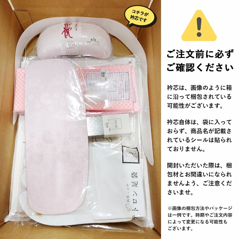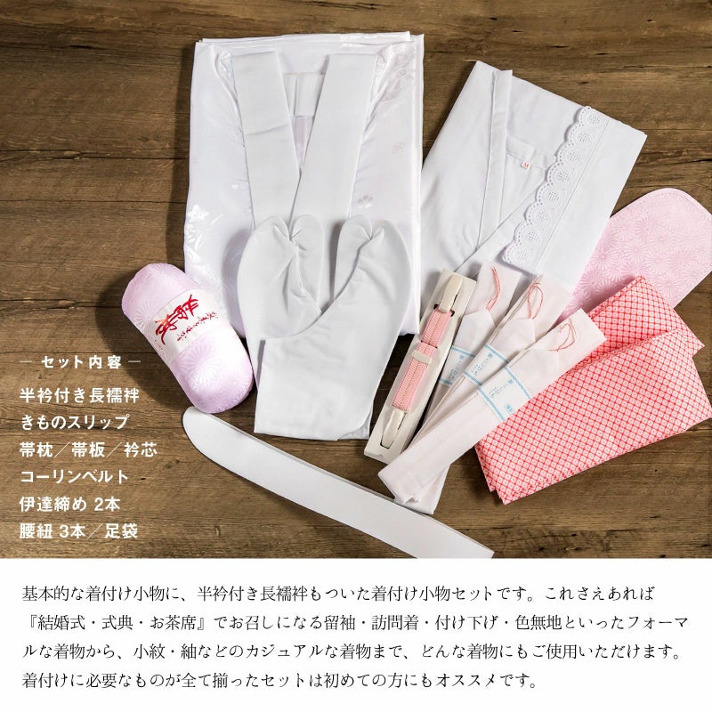【セット内容】長襦袢、着物スリップ、伊達締め2本、帯板、帯枕、衿芯、腰紐3本、コーリンベルト、白足袋の計12点