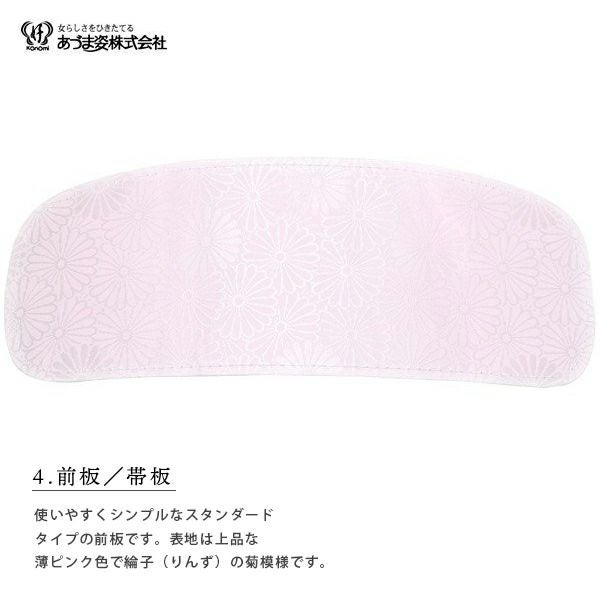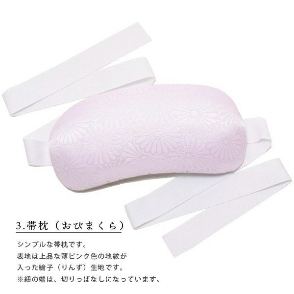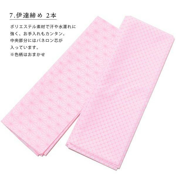 【カラー】襦袢は白色系です。地紋はおまかせです。着物スリップ、腰紐、白足袋は白色です。伊達締めは色柄おまかせです。コーリンベルトはピンクです。帯板、帯枕は地紋の入ったピンク色系です。地紋はおまかせです。