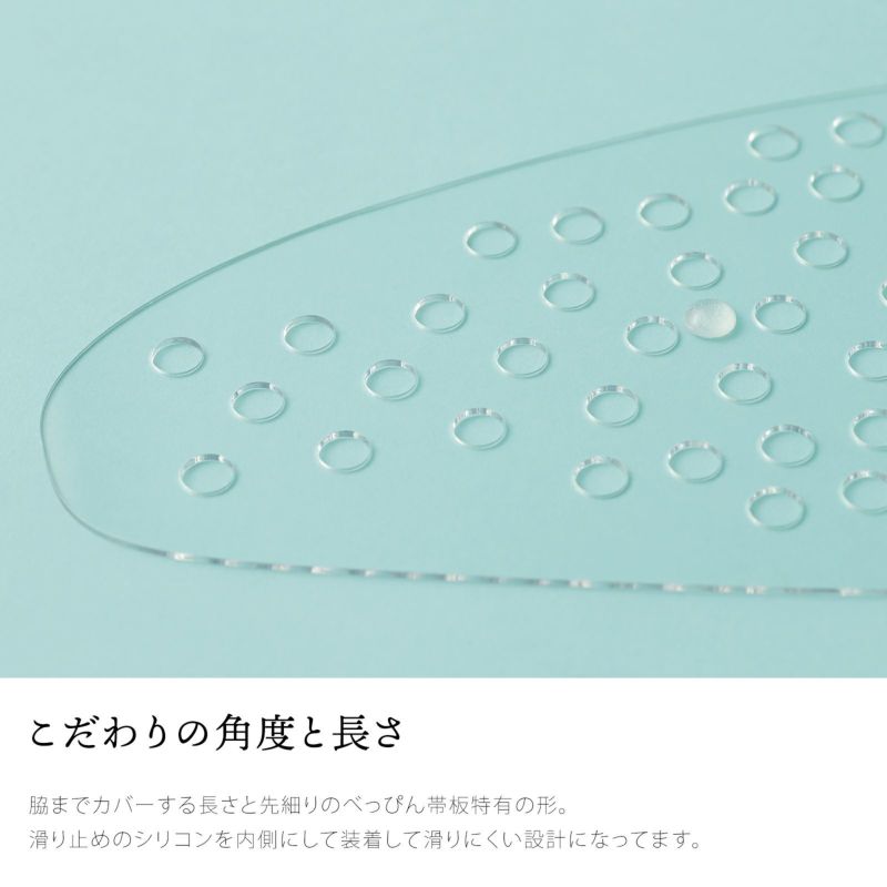 脇までカバーする長さと先細りのべっぴん帯特有の形で、腰骨にもあたらず長時間使用も快適です。