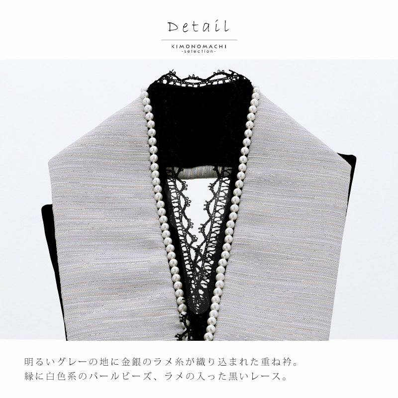【色柄】明るいグレーの地に金銀のラメ糸が織り込まれた重ね衿。縁に白色系のパールビーズ、ラメの入った黒いレース。