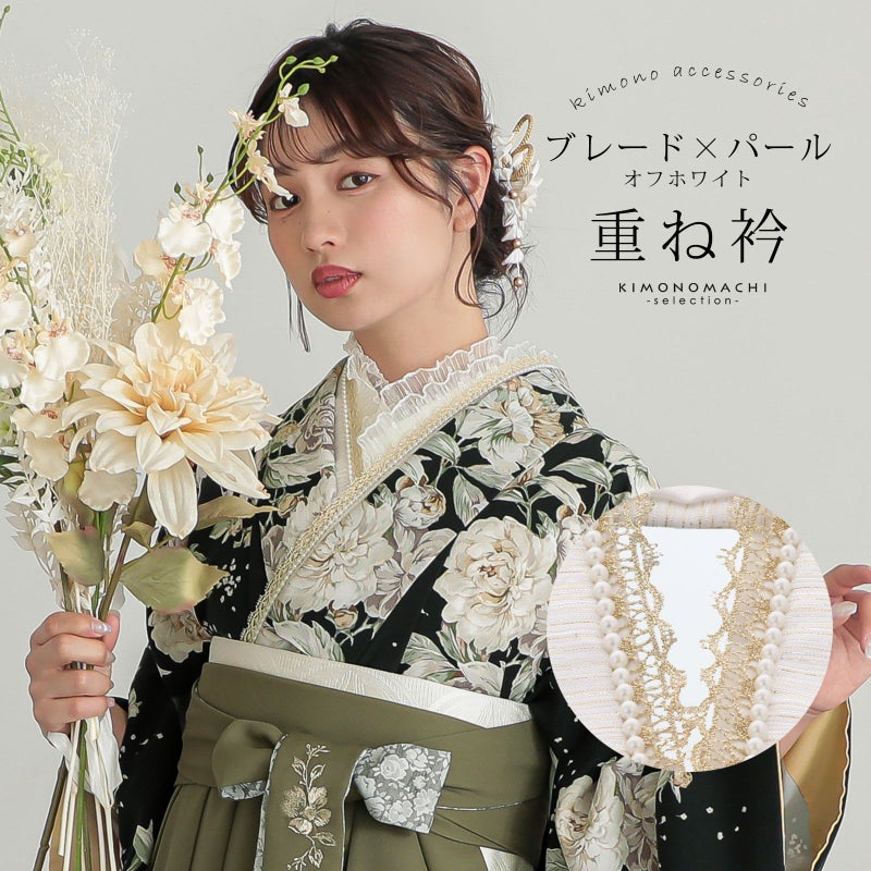 お着物の衿元をより華やかにしてくれる、パールビーズ付きの重ね衿です。