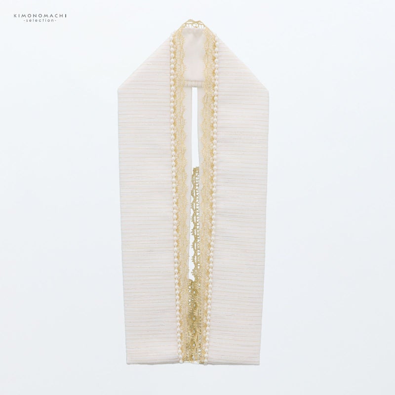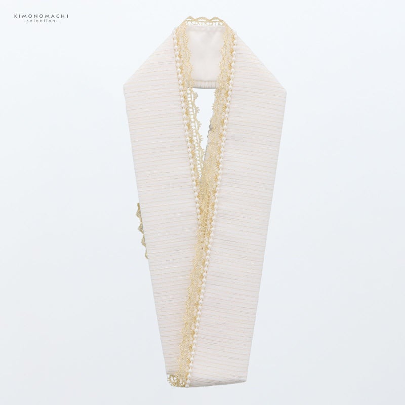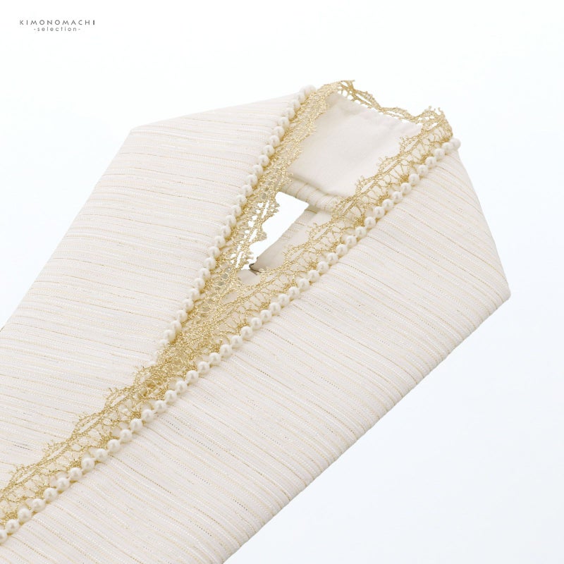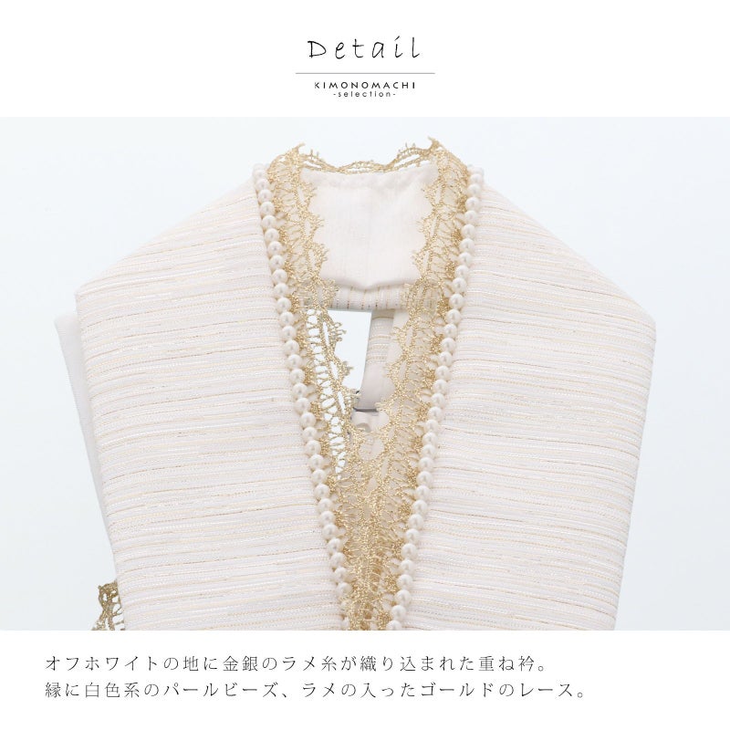 【色柄】オフホワイトの地に金銀のラメ糸が織り込まれた重ね衿。縁に白色系のパールビーズ、ラメの入ったゴールドのレース。