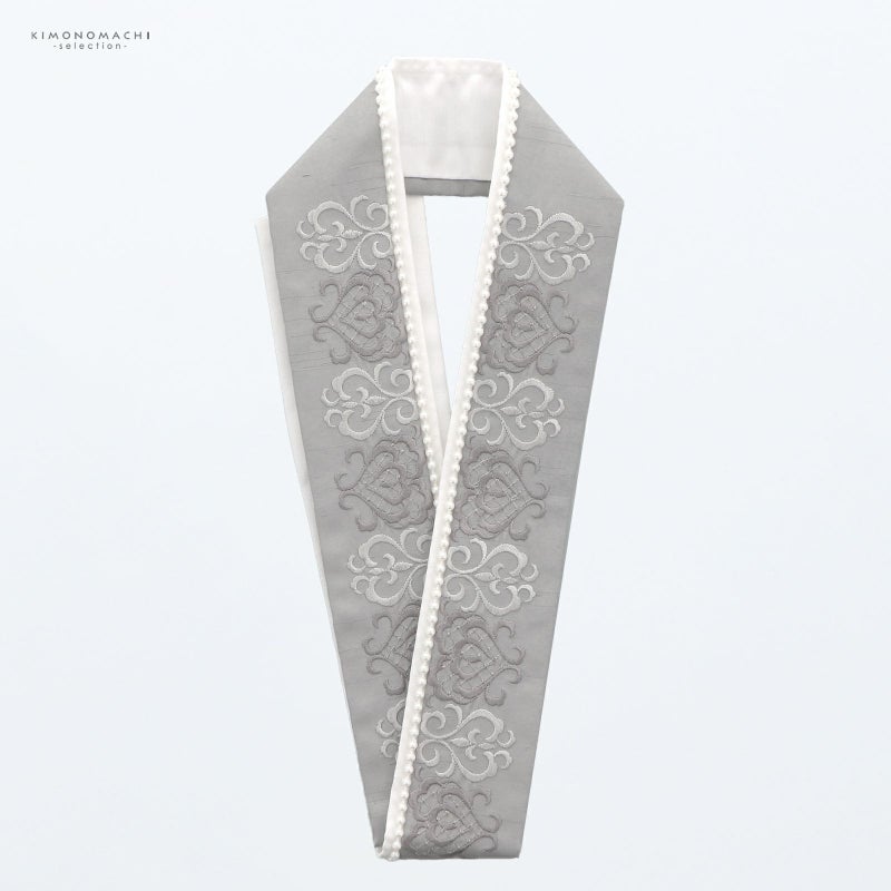 【色柄】グレーの地にベージュグレー、ライトグレーのアラベスク文様が刺繍された重ね衿。白色系のパールビーズ、オフホワイトの縁取り。