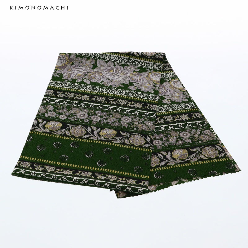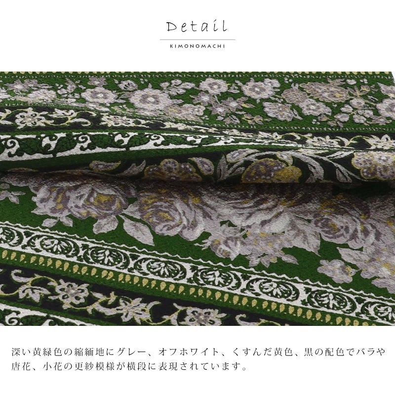 【色柄】深い黄緑色の縮緬地にグレー、オフホワイト、くすんだ黄色、黒の配色でバラや唐花、小花の更紗模様が横段に表現されています。