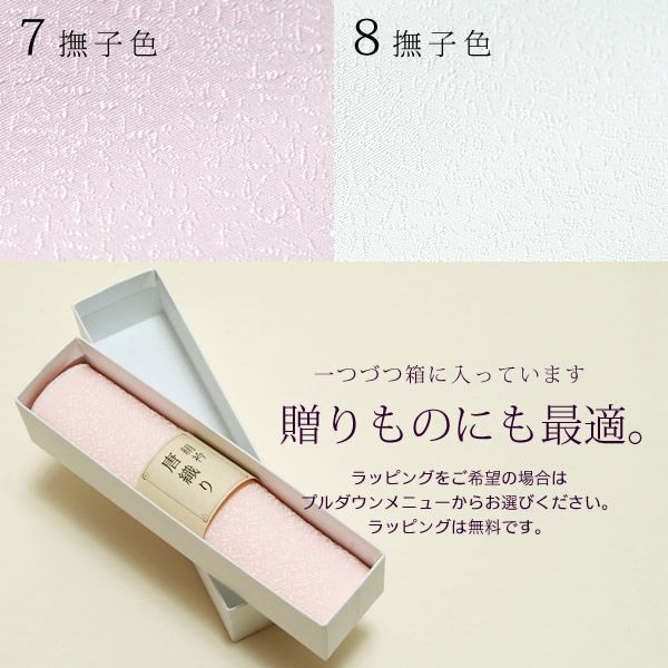 正絹の半衿です。唐織りの地模様が入っていますので、衿元で繊細に反射する光加減と人とは違うお洒落感が楽しめます。お色はどれも非常に淡いものですので、さりげなく着物を引き立ててくれ、悪目立ちしません。ひとつづつお箱にお入れしてお届けしますので、使わない時の収納に便利です。また着物を着られる方ならちょっとした贈りものにしても喜ばれます。 【お洗濯】 こちらの半衿は、クリーニングへお出しいただくことも可能ですし、またお家で手洗いしていただくことも可能です。デリケート洗い専用の洗剤かシャンプーで優しく手洗いしてください。絹100%ですので全く縮まないわけではありませんが、付けられなくなるほど縮んでしまうわけではないのでお家で経済的に手洗いされるのも良いかと思います。 【素材】 絹100% 【サイズ】 約16.5cm×約108cm 【ラッピング】 ご希望の場合は個別にラッピング可能(無料) その他の白半衿はこちら その他の刺繍半衿はこちら