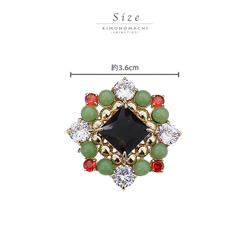 ひし形にカットされたストーンを中心に、複数色の丸石とクリアストーンをバランスよく配したゴールドフレームの帯留めと、帯締めをセットにしました。