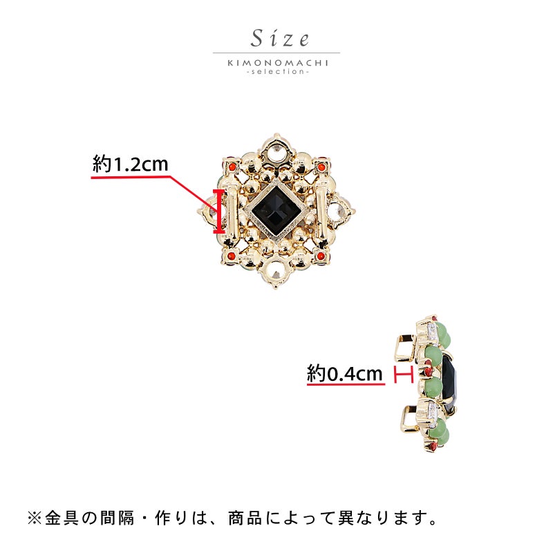【色柄】帯留はゴールドの座金に黒の四角いカットビーズ、灰緑と赤のビーズ、白色系のラインストーンが配置されています。帯締めはラメ感のある浅い灰みの紺の組紐にゴールドのエンドパーツ。