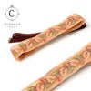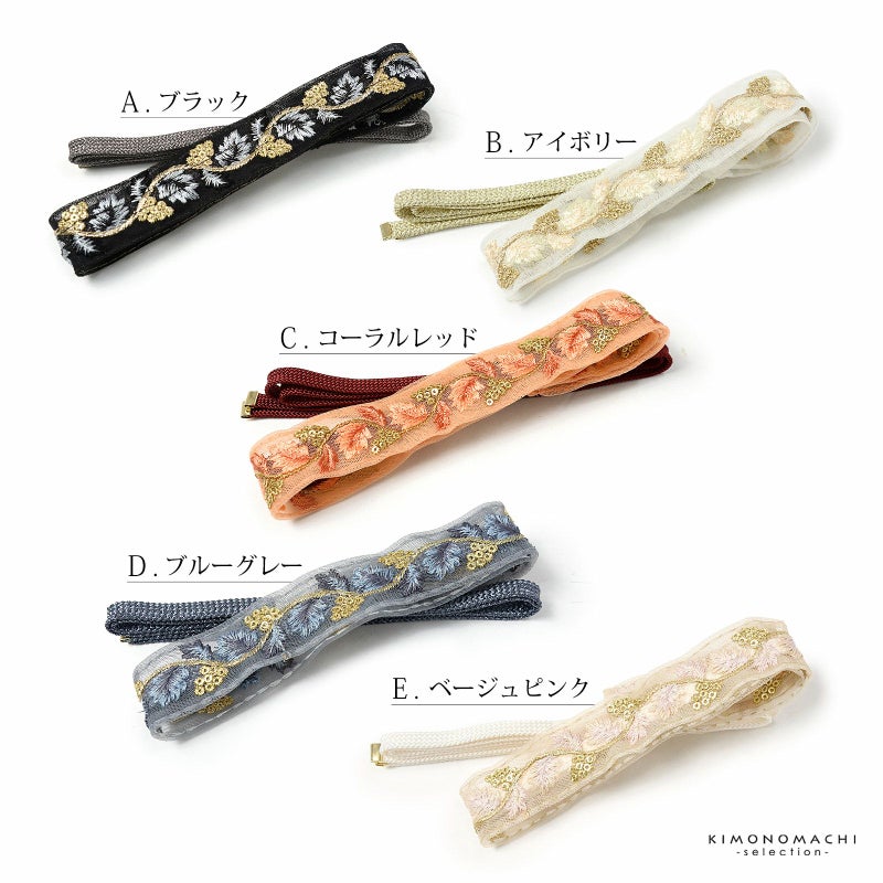 C.コーラルレッド:臙脂色の帯締め。浅い赤のチュール地、やわらかい赤の葉にゴールドのスパンコールの実の葡萄唐草の刺?リボン。