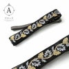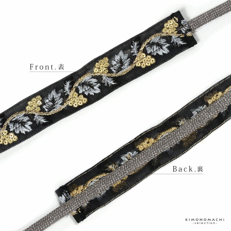 A.ブラック:ガンメタリックの帯締め。ブラックのチュール地、ブルーグレーの葉にゴールドのスパンコールの実の葡萄唐草の刺?リボン。