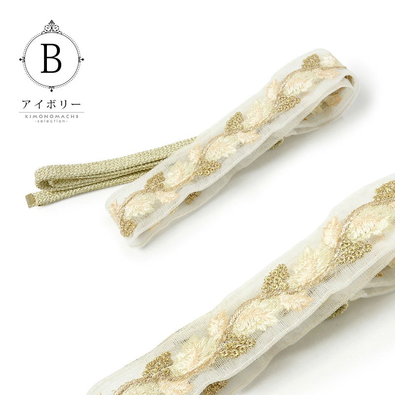 B.アイボリー:メタリックゴールドの帯締め。アイボリーのチュール地、クリーム色の葉にゴールドのスパンコールの実の葡萄唐草の刺?リボン。