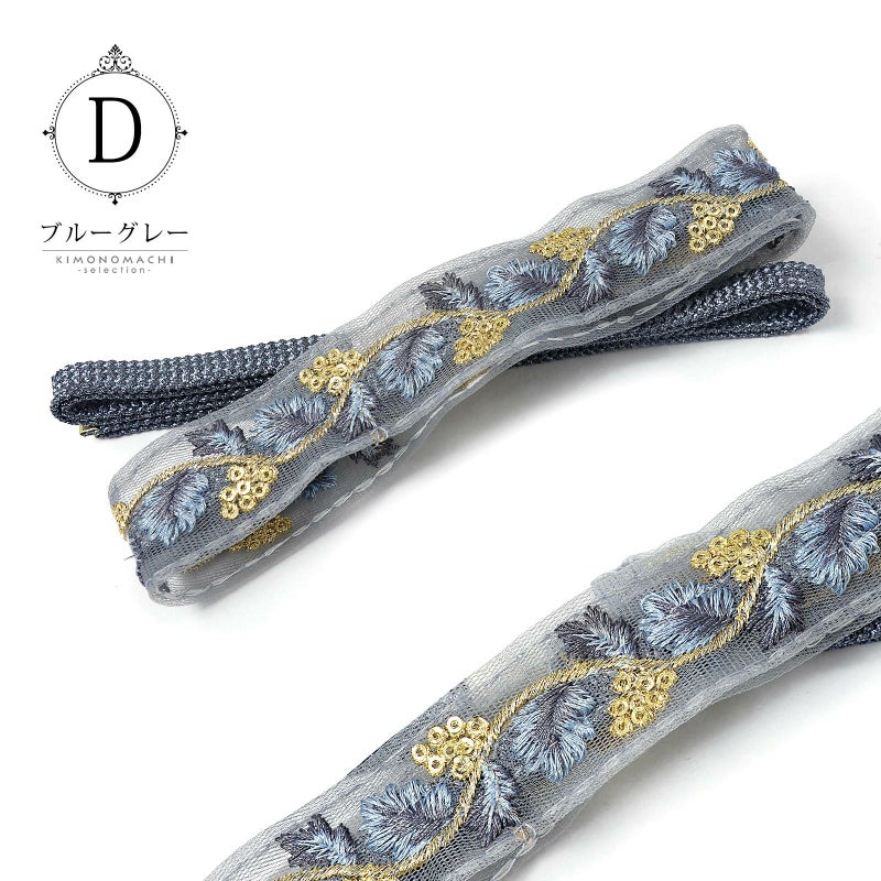 D.ブルーグレー:ラメ感のあるスモークブルーの帯締め。ブルーグレーのチュール地、スモークブルーの葉にゴールドのスパンコールの実の葡萄唐草の刺?リボン。