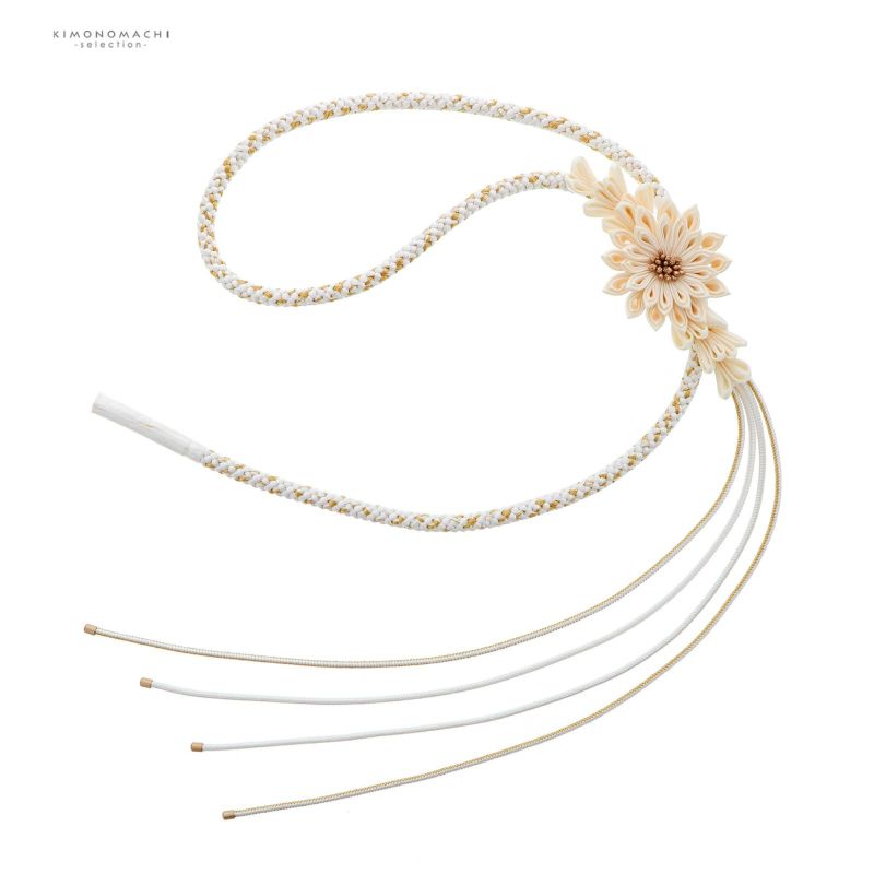 C.アイボリー:白を基調としてゴールドが入った丸組。つまみの飾りを挟んで、4本に分かれた白とゴールドの細い組紐。つまみの飾りは、アイボリーの二重剣つまみの菊の花。中央にブロンズゴールド。菊の両側にアイボリーのつまみの花びら飾り。