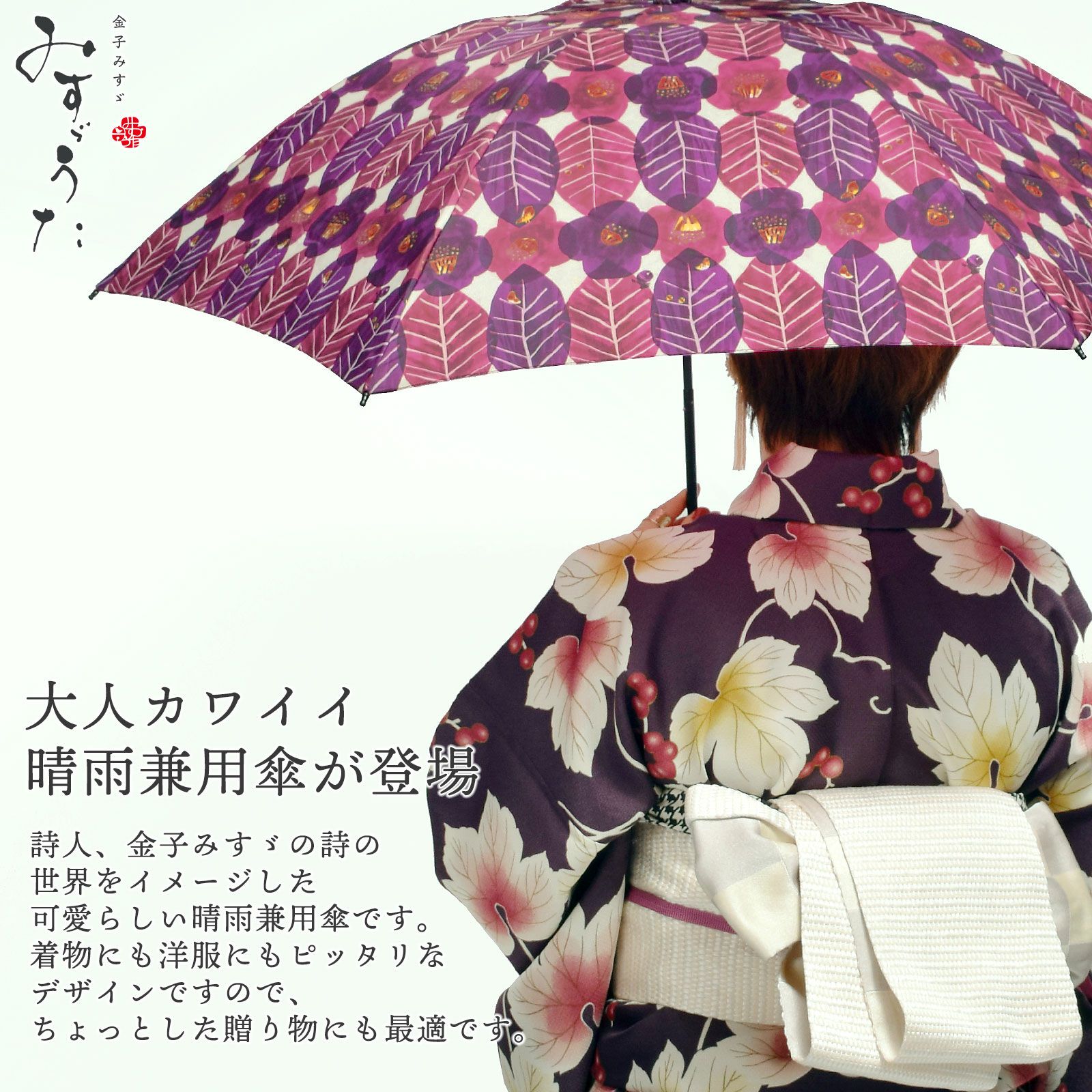 他の画像を見る 大人カワイイ晴雨兼用傘 UVケア加工 プレゼントに最適 みすゞうた 折り畳み傘 「郵便局の椿/私と小鳥と鈴と」全4柄 晴雨兼用 UVケア加工 6本骨 48cm お取り寄せ品 <U>【メール便不可】<H> きもの町価格 ¥ 5,500 税込 詳細を見る お気に入りに登録する