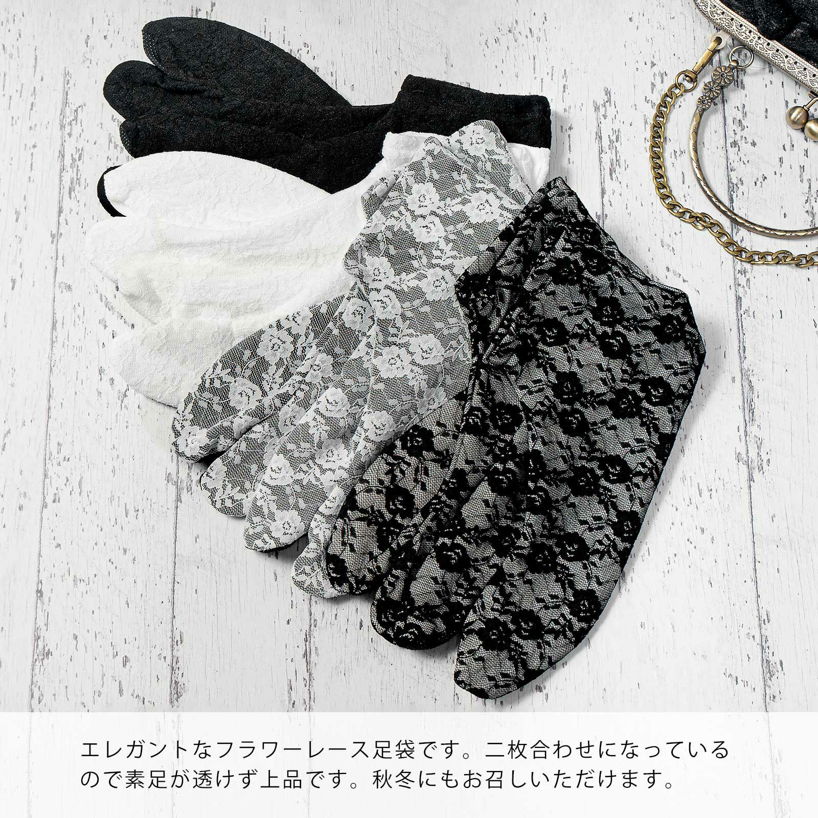 エレガントなフラワーレース足袋です。二枚合わせになっているので素足が透けず上品です。秋冬にもお召しいただけます。