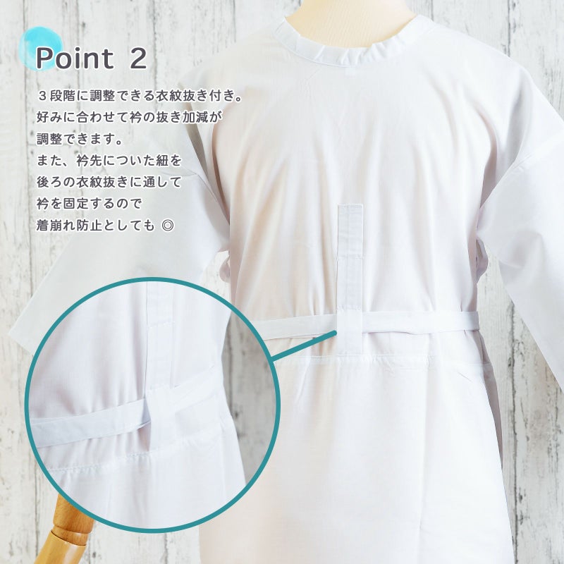 好みに合わせて衿の抜き加減が調整できます。また、衿先についた紐を後ろの衣紋抜きに通して衿を固定するので着崩れ防止としても◎