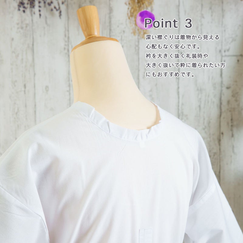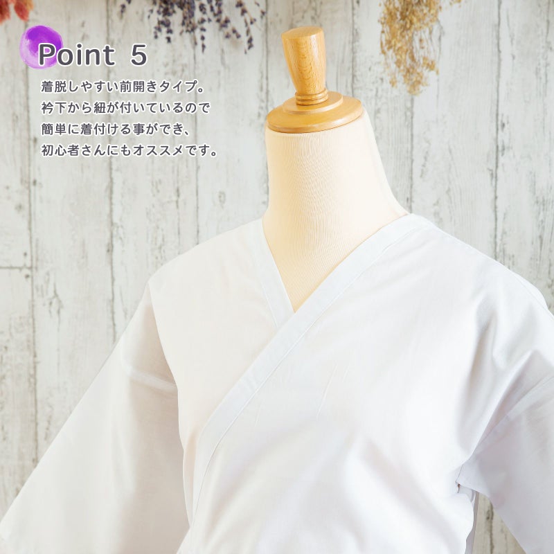 深い襟ぐりは着物から見える心配もなく安心。身八つ口があるので風通しが良く快適です。着脱しやすい前開きタイプで、簡単に着付ける事ができ初心者さんにもオススメです。