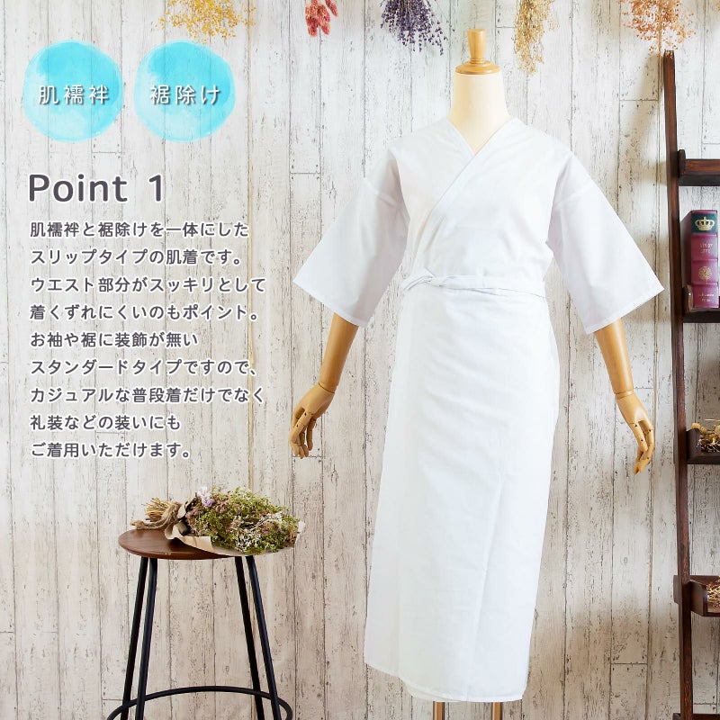 肌襦袢と裾除けが一体になった、スリップタイプの肌着です。シンプルなのに多機能&オールシーズン使えて、着物の種類も選ばないので1枚持っておくと便利です。