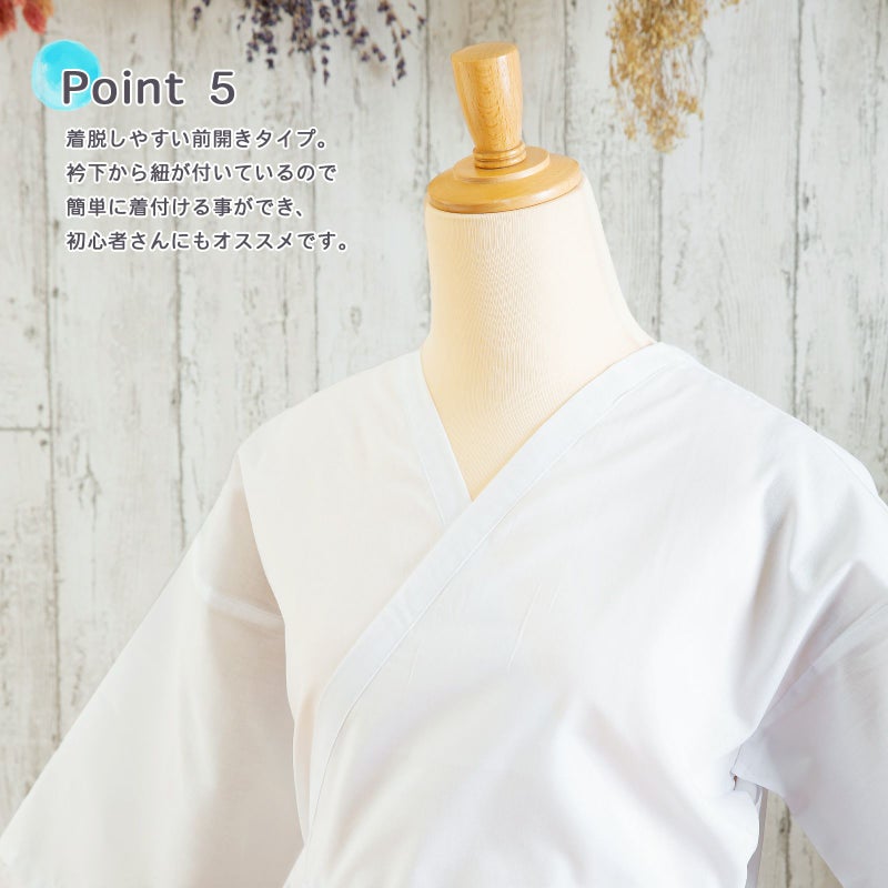 深い襟ぐりは着物から見える心配もなく安心。身八つ口があるので風通しが良く快適です。着脱しやすい前開きタイプで、簡単に着付ける事ができ初心者さんにもオススメです。