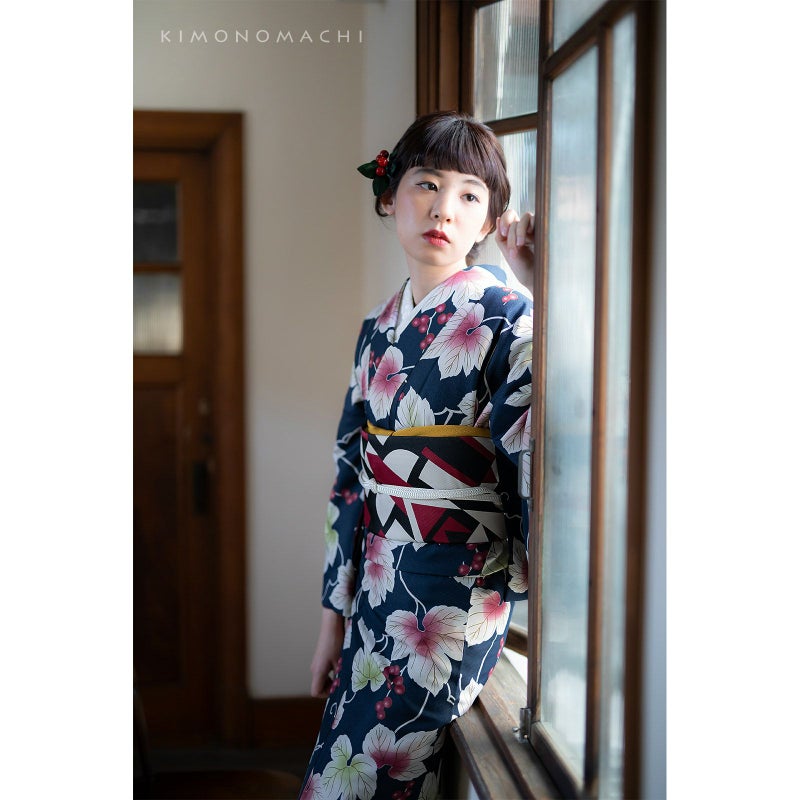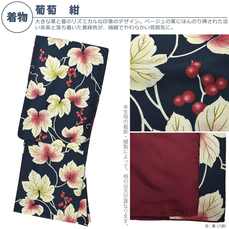 深い紺地。細かな地模様のある生地です。大きな葉と蔓のリズミカルな印象のデザイン。ベージュの葉にほんのり挿された淡い赤紫と落ち着いた黄緑色が、繊細でやわらかい雰囲気に。赤紫の小粒の葡萄は、控えめなかわいらしさと野趣を感じさせます。アンティーク風の深みのある色合いが、移ろう季節の気分にピッタリです。裏地は深い臙脂色。