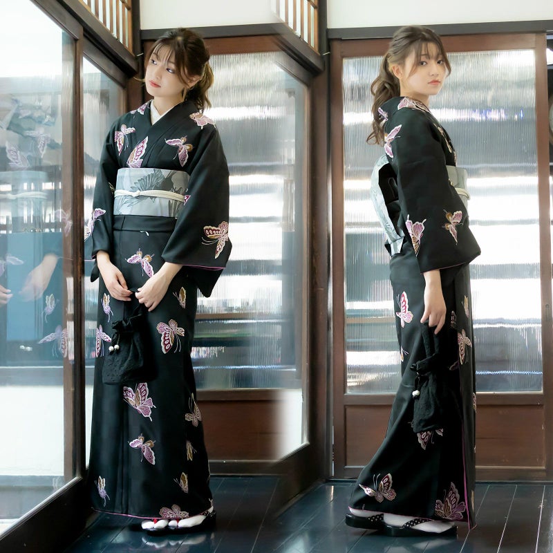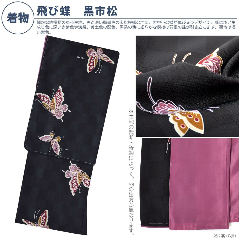 細かな地模様のある生地。黒と深い藍墨色の市松模様の地に、大中小の蝶が飛び交うデザイン。蝶は淡い生成り色に深い赤紫色や浅紫、黄土色の配色。黒系の地に細やかな模様の羽根の蝶が引き立ちます。裏地は浅い紫色。