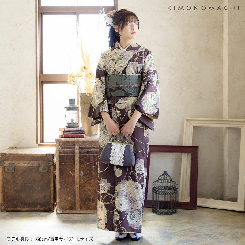 京都きもの町オリジナルブランド「KIMONOMACHI」の袷着物と京袋帯に、帯揚げと帯締めがセットになった、カジュアルな小紋の袷着物セットです。春・秋・冬にお召しいただけます。