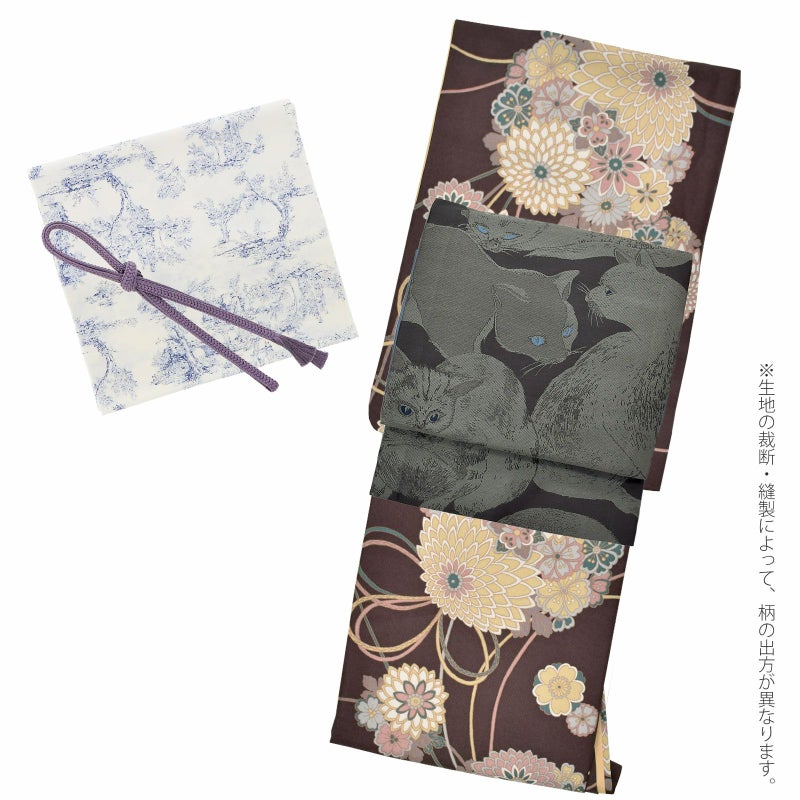 京袋帯:チャコールグレーの地に、スモークブルーとネイビーの目を光らせる灰猫の姿。光の加減で浮き上がるようなアイビーグレーの毛並みが繊細に表現されています。夕闇になる前の、空と地面が同じ色に溶けあう中にほの見える猫たちの表情、リアルな姿が魅力的。猫好きさんへ自信を持っておすすめする、美しい猫の帯です。裏地は深いスモークブルー。