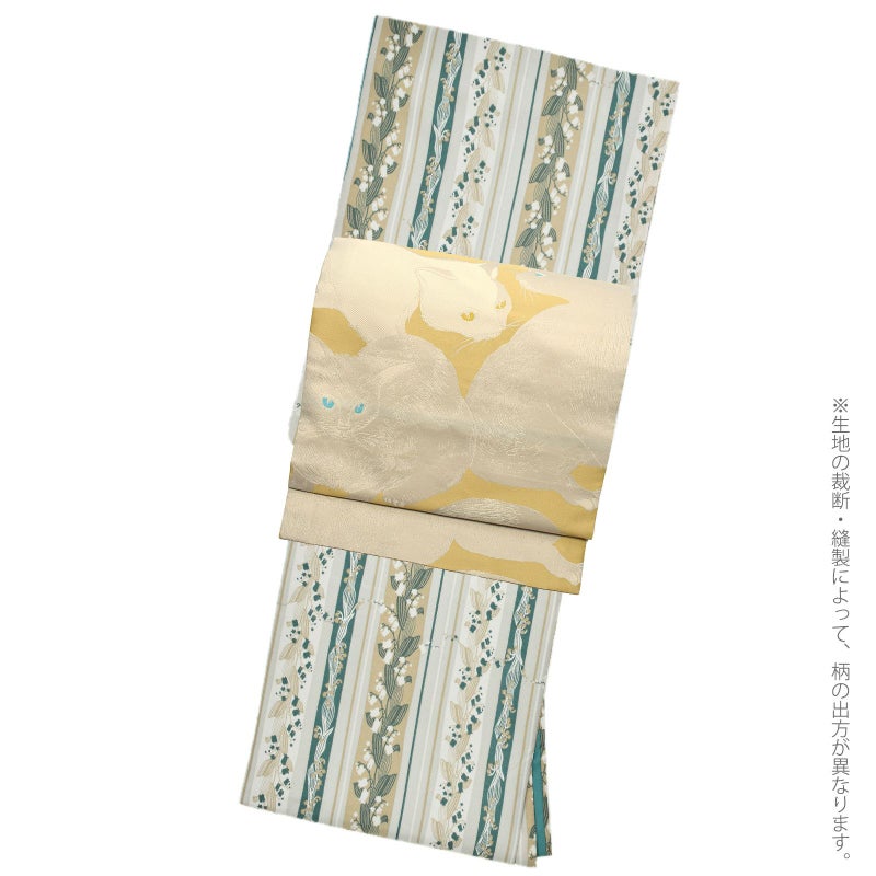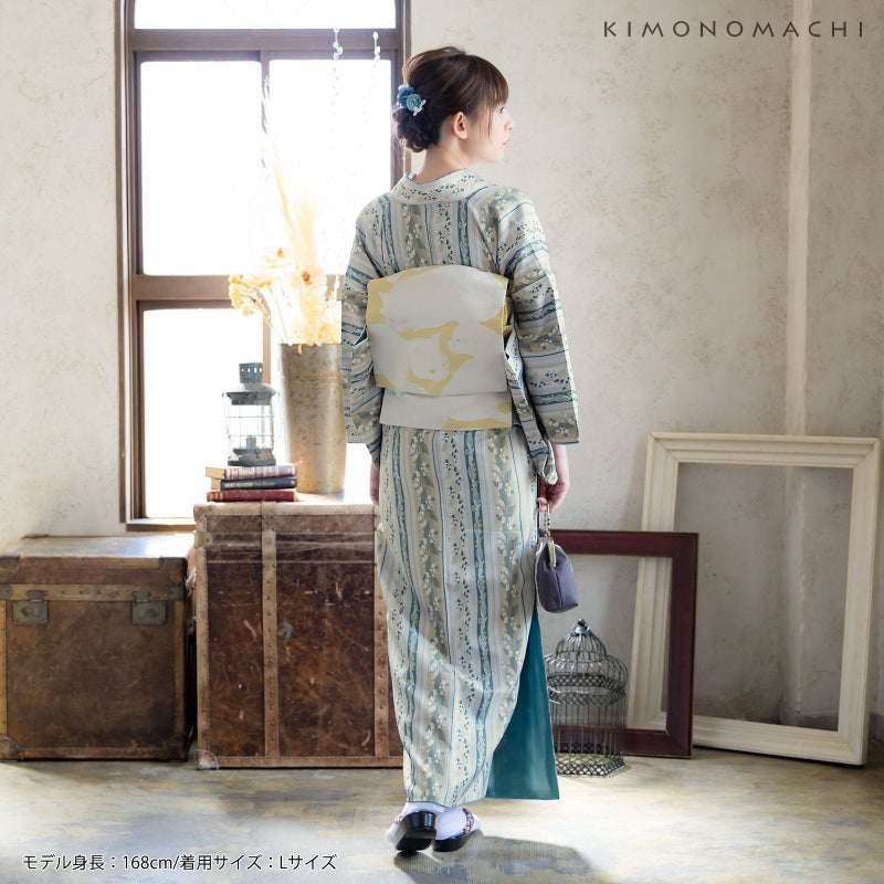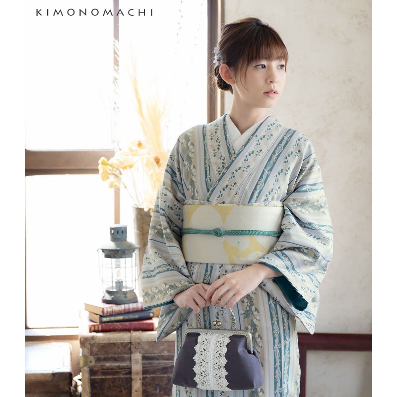 着物:細かな地模様のある生地。淡いグレー地にオフホワイト、黄みのベージュと青緑色の縦縞の中に、抽象的に表現された大小のスズランの連続模様が配置されています。かわいらしいスズランを更紗縞風に構成した、和洋の魅力を兼ね備えたデザインです。裏地は浅い青緑。