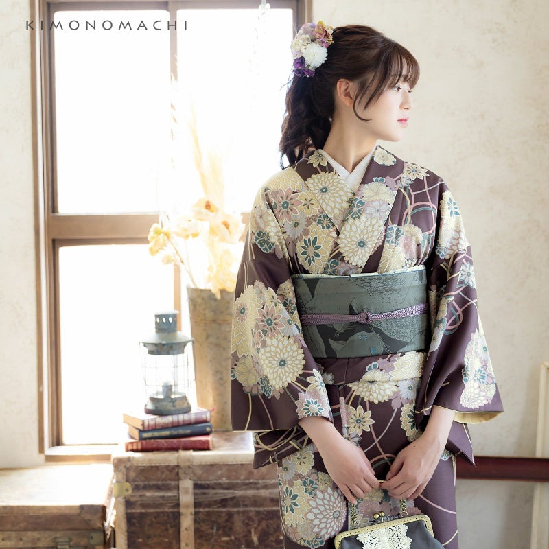 着物:細かな地模様のある生地。グレイッシュな赤みの茶色地に薄茶の輪郭線で大きな花の薬玉文様が表現されています。浅い黄色、鈍い薄紅色、白、青緑、グレーの抽象的な菊や桜の花々、間を流れる組紐がデザインに動きを生み出しています。華やかな古典文様が現代的なやわらかい配色でまとめられています。裏地はベージュ。