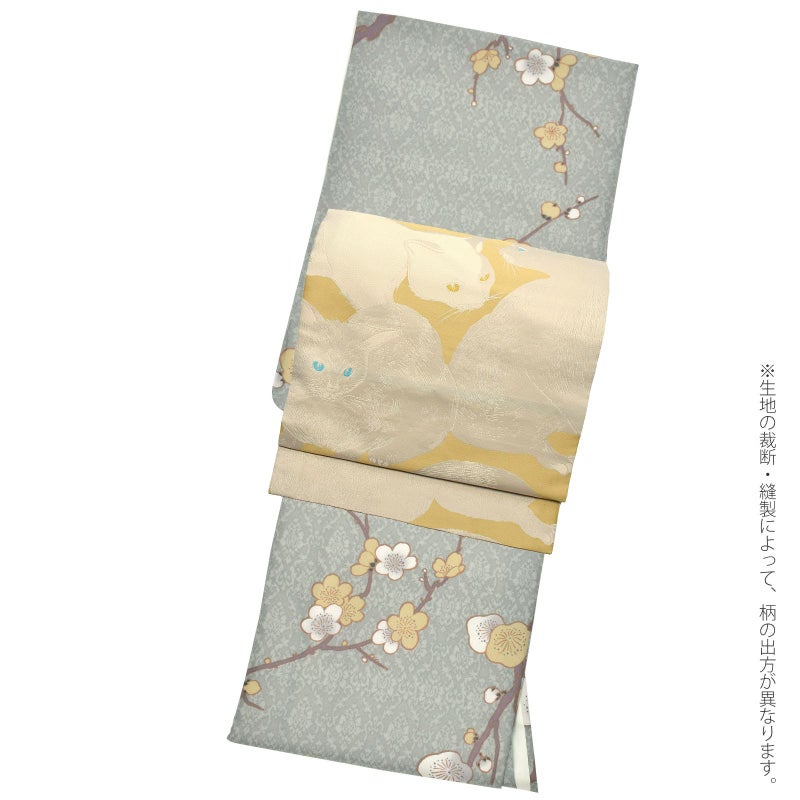 着物:細かな地模様のある生地。わずかに青みのあるグレーの地に淡いグレーの細かなアラベスク文様。その上に光琳風のやわらかな形の梅の花が表現されています。ローズグレーの枝、淡い黄色とグレーぼかしの入った白の梅の花、萼の深い青緑が全体を引き締めています。古典的な枝梅を洗練された雰囲気に仕上げたデザインです。裏地は白。