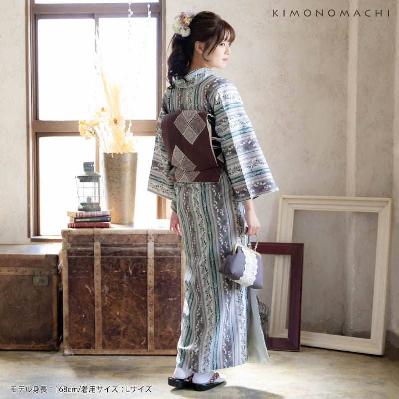 着物:細かな地模様のある生地。淡いグレー地にオフホワイト、グレイッシュなパープルと青緑色の縦縞の中に、抽象的に表現された大小のスズランの連続模様が配置されています。かわいらしいスズランを更紗縞風に構成し、現代的な配色で大人っぽく仕上げたデザインです。裏地は白。