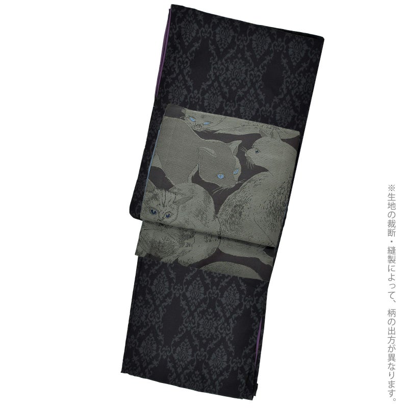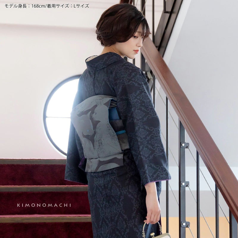 京袋帯:チャコールグレーの地に、スモークブルーとネイビーの目を光らせる灰猫の姿。光の加減で浮き上がるようなアイビーグレーの毛並みが繊細に表現されています。夕闇になる前の、空と地面が同じ色に溶けあう中にほの見える猫たちの表情、リアルな姿が魅力的。猫好きさんへ自信を持っておすすめする、美しい猫の帯です。裏地は深いスモークブルー。