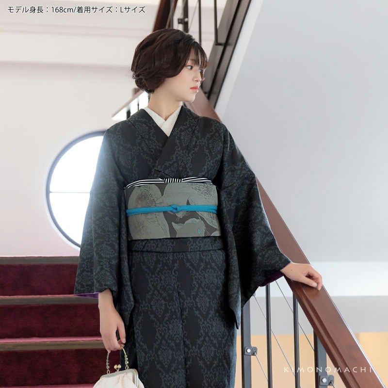 袷着物:細かな地模様のある生地。黒地にグレーのアラベスク文様。菱形の唐花に立涌状に伸びる蔓草文様とモノトーンの配色が、華やかさとミステリアスな魅力を放つデザインです。裏地は紫。