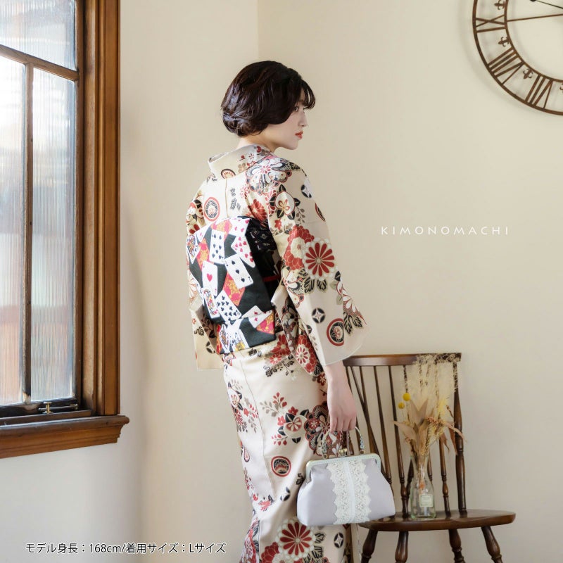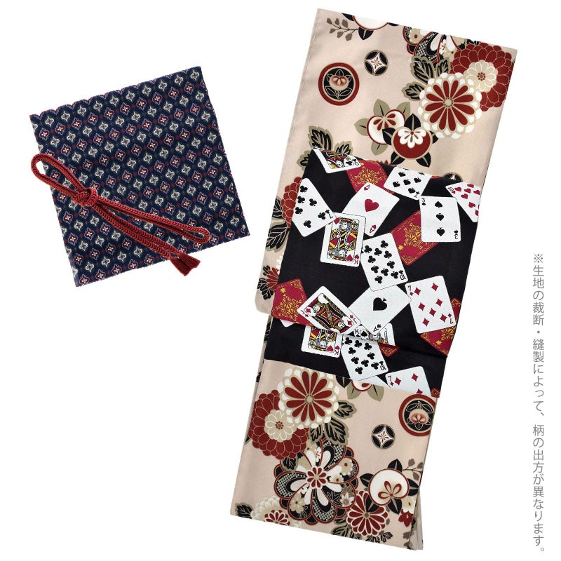 京袋帯:黒地にトランプのカードを散らしたデザイン。白地に各種のスートの数札、絵札の表情まで細やかに表現されています。臙脂色に金茶のアラベスク模様の裏面がアクセント。