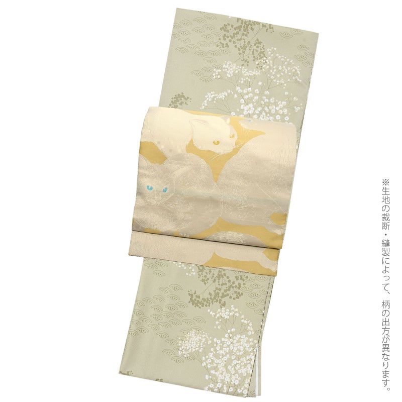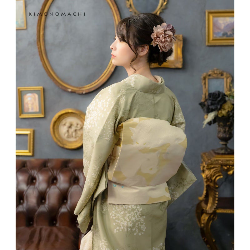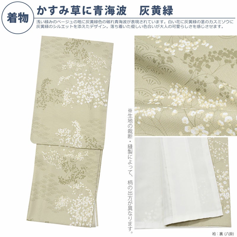 着物:浅い緑みのベージュの地に灰黄緑色の破れ青海波が表現されています。白い花に灰黄緑の茎のカスミソウに灰黄緑のシルエットを添えたデザイン。落ち着いた優しい色合いが大人の可愛らしさを感じさせます。裏はオフホワイト。