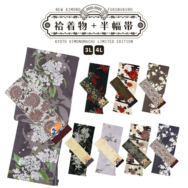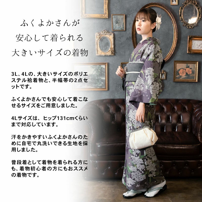 3L、4Lの、大きいサイズのポリエステル袷着物と、半幅帯の2点セットです。
