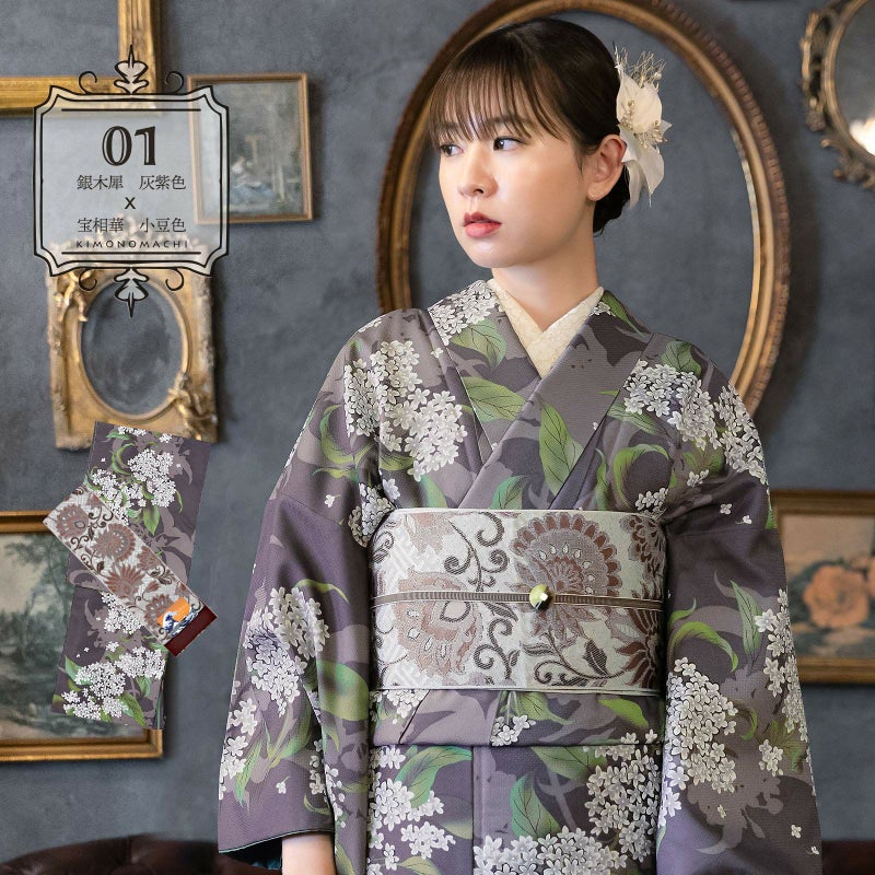着物:やや暗めの灰紫色の地に全体に表現されたギンモクセイ。白にグレーぼかしの小さな花々、濃いこげ茶に緑のぼかしの葉がデザインに変化をつけ、浅紫色のシルエットが奥行きを添えています。優しい色合いにギンモクセイの清楚な小花が大人かわいい印象です。裏地は灰みの深緑色。
