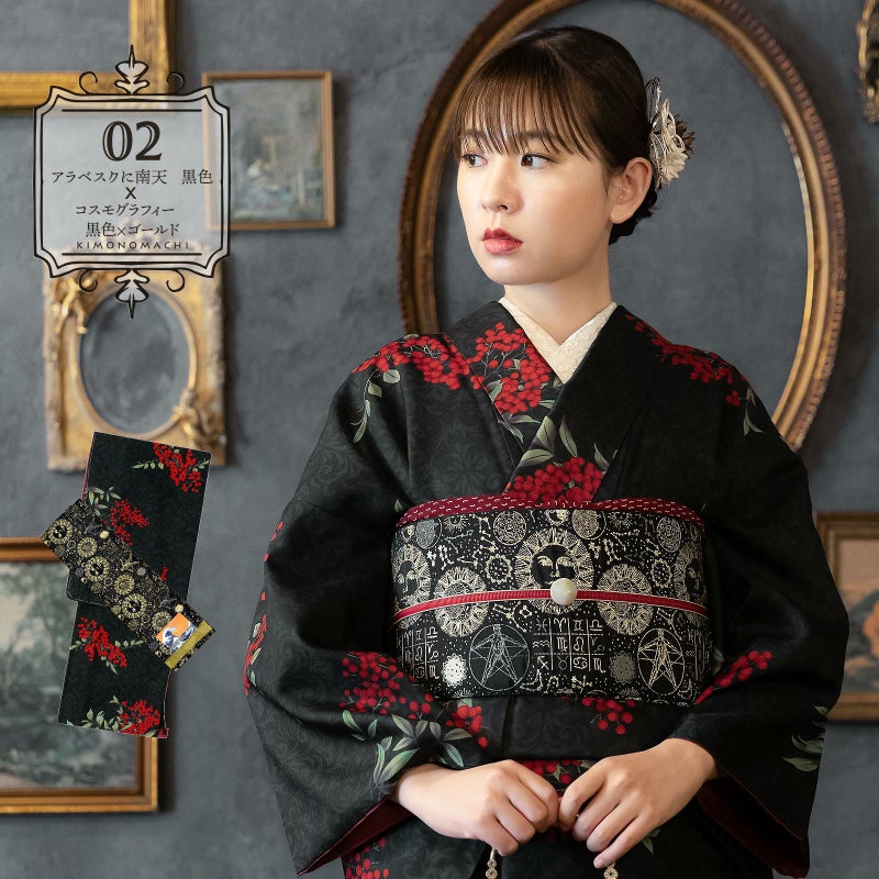 着物:黒地に濃いグレーのアラベスク文様、その上に赤い南天が表現されています。深い赤色の実に灰黄緑の枝葉、チャコールのぼかしが立体感を演出。ダークな中に華やかさのあるデザインです。裏地は深い赤色。