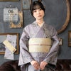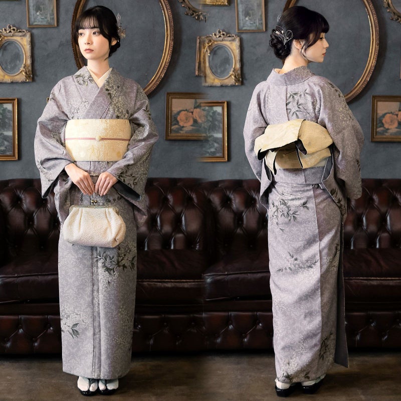 着物:藤色の地に淡いパープルグレーのアラベスク文様、その上に白南天が表現されています。月白色の実に煤竹色の枝葉、ベージュのぼかしが立体感を演出。和風と異国風、両方の魅力が調和したデザインです。裏地は薄鈍色。