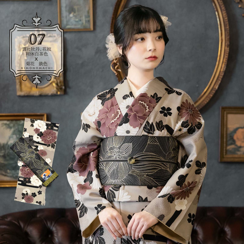 07.雲に牡丹、花紋 利休白茶色×菊花 鉄色