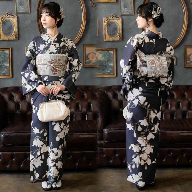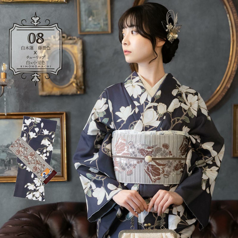 着物:グレイッシュな暗めの青紫色の地に枝を伸ばした白木蓮。淡いベージュのぼかしが入った白い花に薄茶の枝、萼や蕊の深い青緑がポイントです。薄香色の輪郭線が花を際立たせ、咲きこぼれる木蓮の清らかな魅力を演出しています。裏地は薄鈍色。