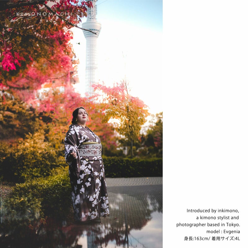 着物:ココアのような浅い茶色の地に枝を伸ばした白木蓮。淡いベージュのぼかしが入った白い花にこげ茶の枝、萼や蕊の深い黄緑がポイントです。薄香色の輪郭線が柔らかい印象を添え、咲きこぼれる木蓮の優美な魅力を演出しています。裏地はベージュ。