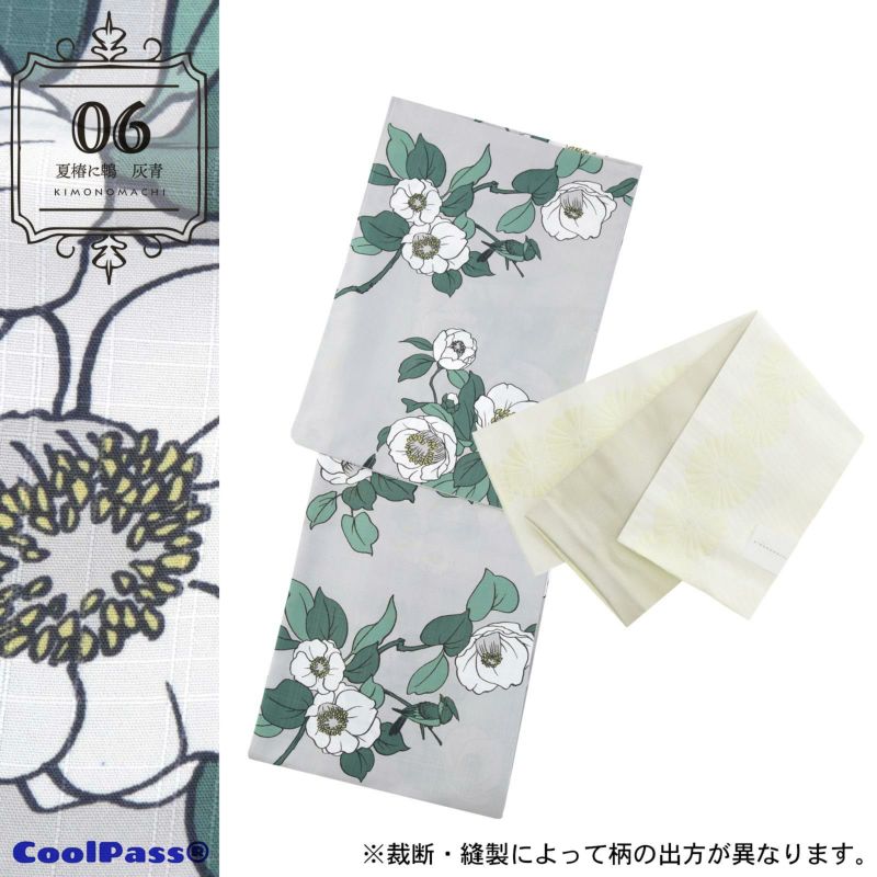 浴衣:やや青みの灰色の地。濃い青緑色の線で描かれた花鳥画風の夏椿(沙羅の花)にヒヨドリ。明るい灰みの黄色の花芯に白の花びら、浅い青緑色や青磁色の葉。同色のヒヨドリが翼をはためかせています。凛と涼やかな気品を感じさせる浴衣です。