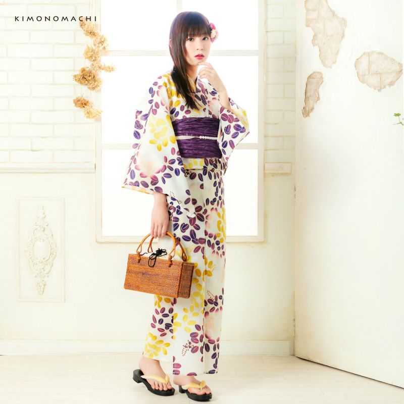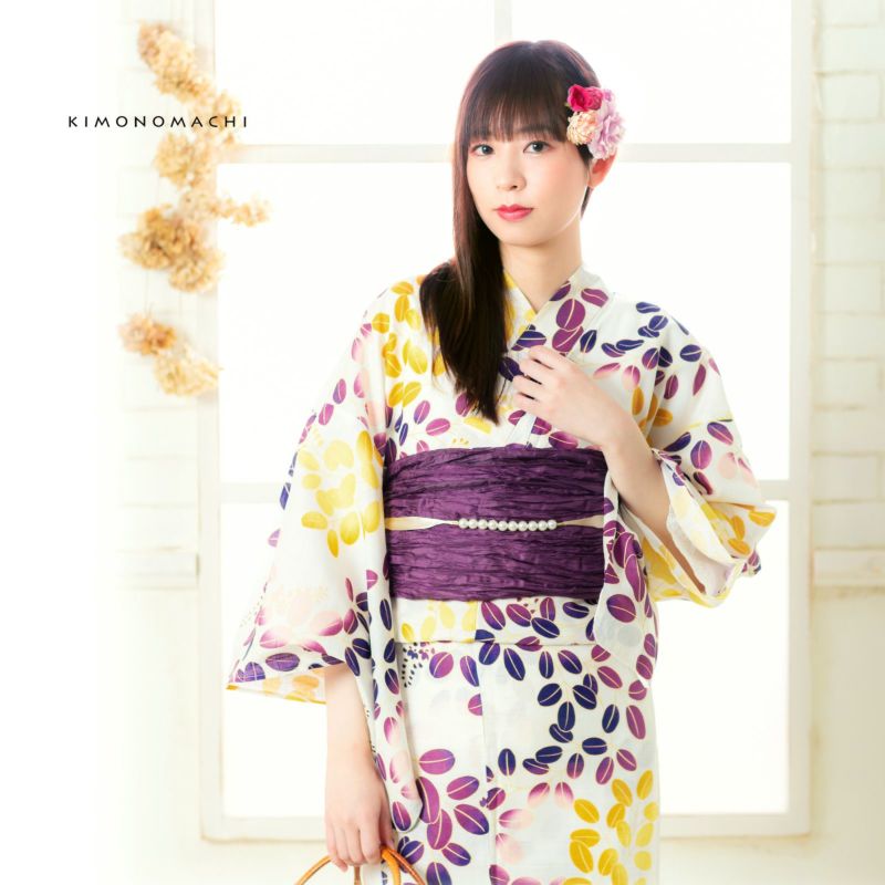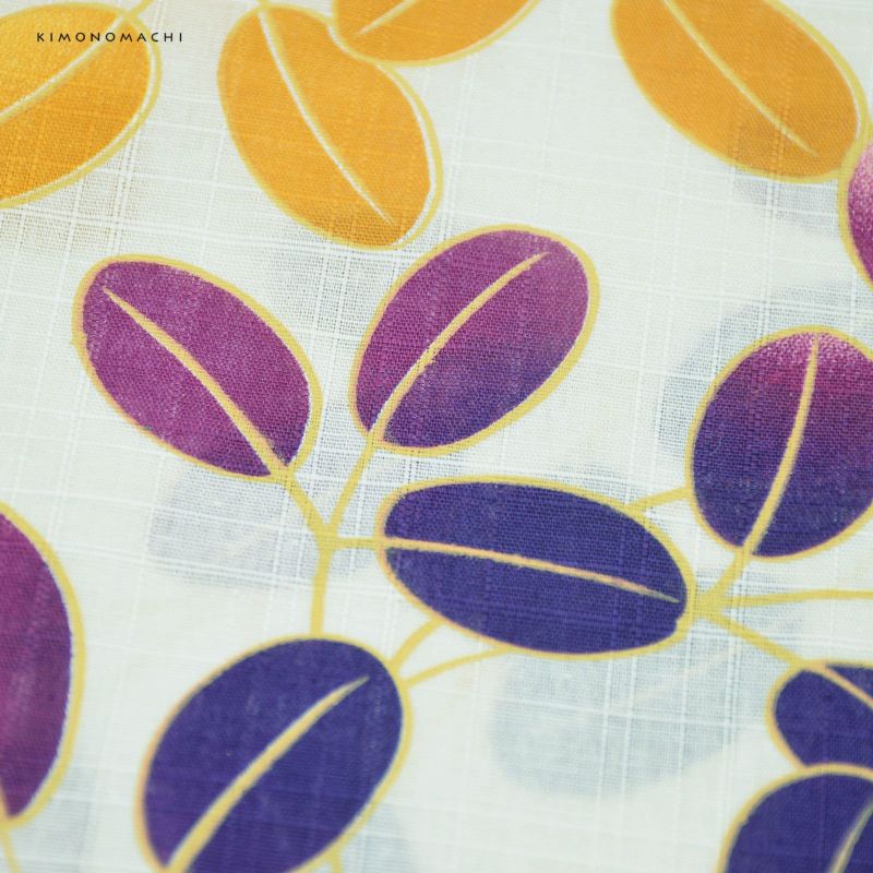 浴衣:柔らかな生成り地に紫色ぼかし、からし色ぼかしの萩模様。