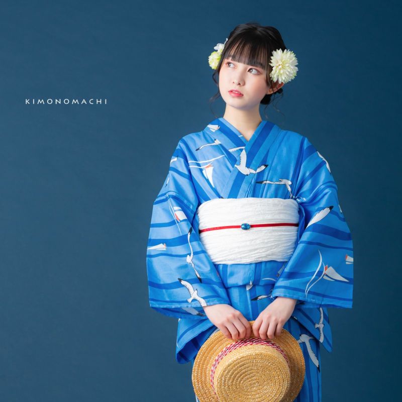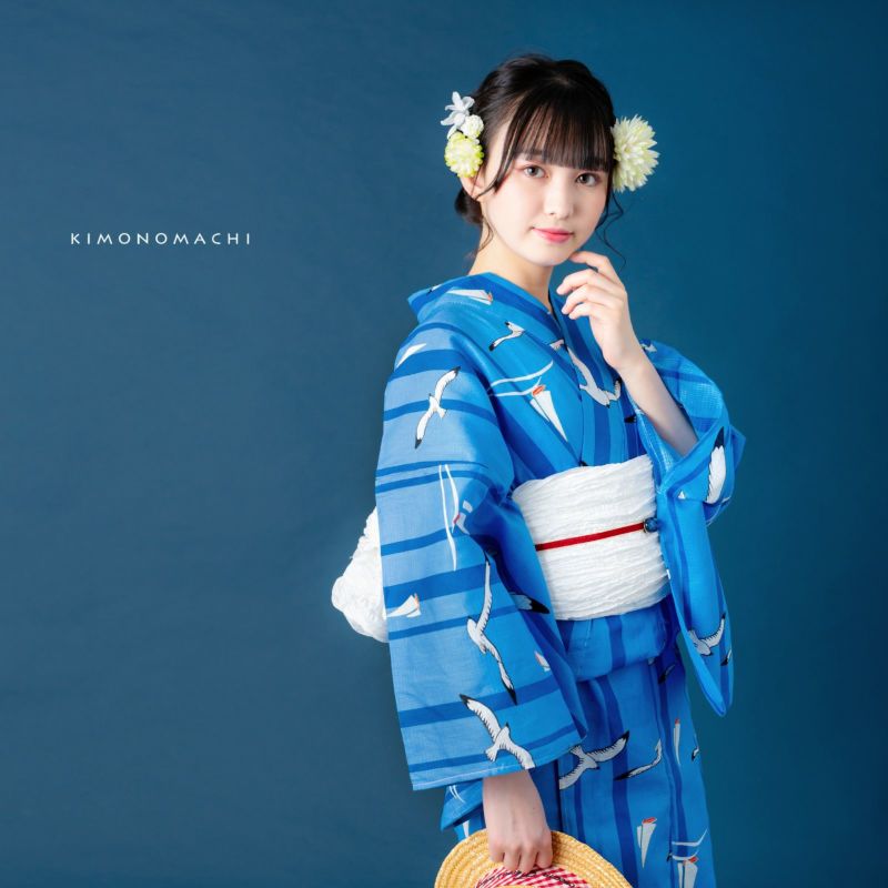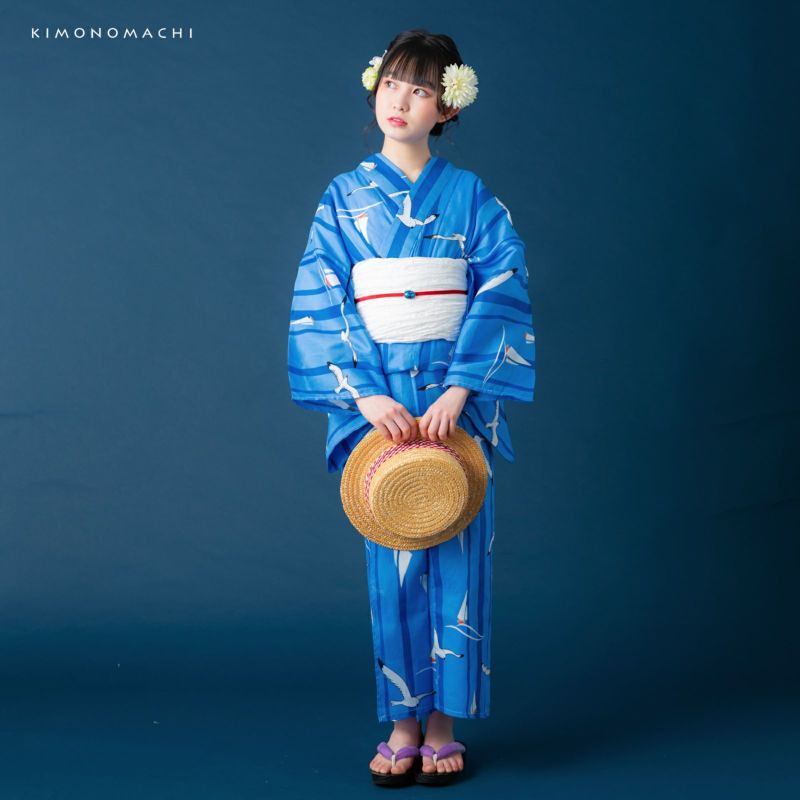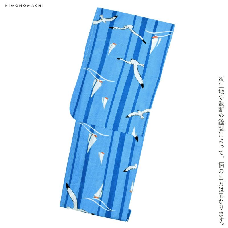 浴衣:シンプルで可愛らしい、マリン柄。濃い目の水色地に、太さの異なる青色の縦ライン。海や空のブルーを思わせる色合いの上のところどころに、黒いラインと白色で翼を広げて飛ぶカモメ、そして波の上に浮かぶ白いヨットのイラスト。
