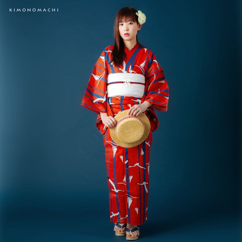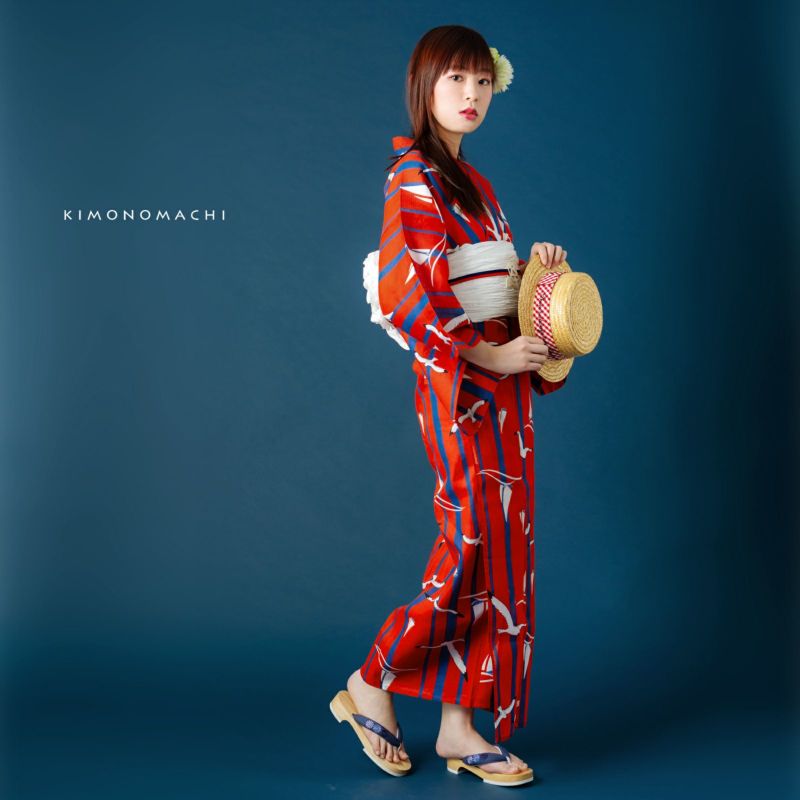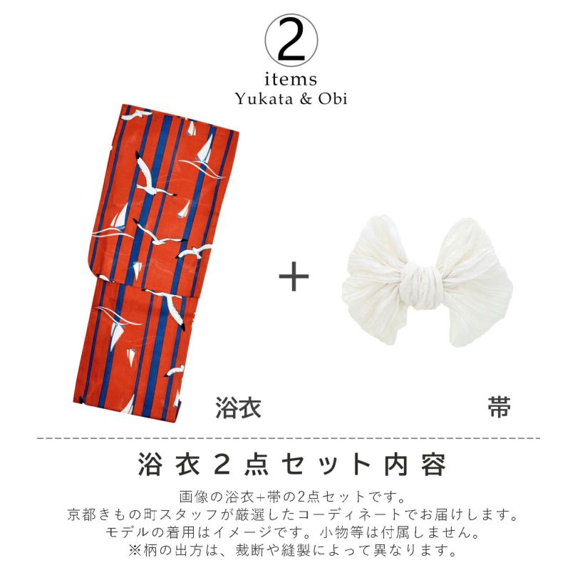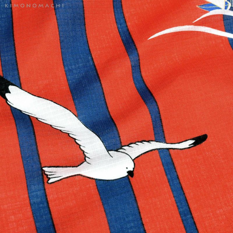 浴衣:ビビッドな印象がキュートなマリン柄。鮮やかな赤色に、太さの異なる明るい紺色の縦ライン。メリハリの効いた色合いの上のところどころに、黒いラインと白色で翼を広げて飛ぶカモメ、そして波の上に浮かぶ白いヨットのイラスト。