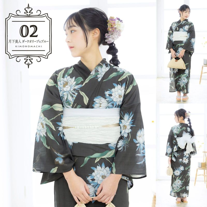 浴衣:暗めのオリーブグレー色の地にチャコールの線で描かれた月下美人の花とアゲハ蝶。グレイッシュなブルーに白の花、浅い黄緑に深い青緑と青磁色の葉の繊細な色の変化が神秘的な印象です。蝶はチャコールに淡いブルー、黄土色の挿し色。